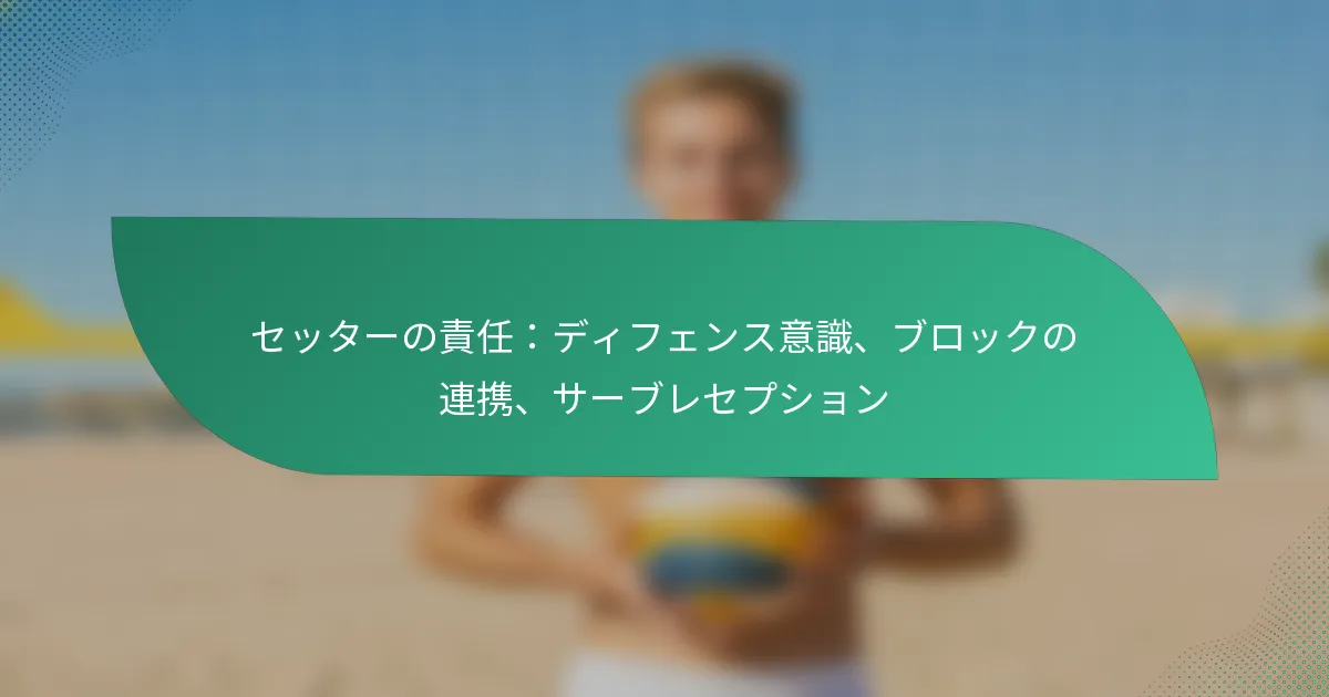 バレーボールにおけるセッターは、攻撃と防御の戦略の両方において不可欠な役割を果たし、主な責任には防御意識、ブロックの調整、サーブのレセプションが含まれます。強い防御意識を維持することで、セッターはプレーを予測し、効果的にポジショニングを行うことができ、ブロックの調整はチームメイトとのシームレスなコミュニケーションとタイミングを確保します。彼らの役割は、成功するプレーを orchestrate し、チーム全体のパフォーマンスを向上させる上で重要です。